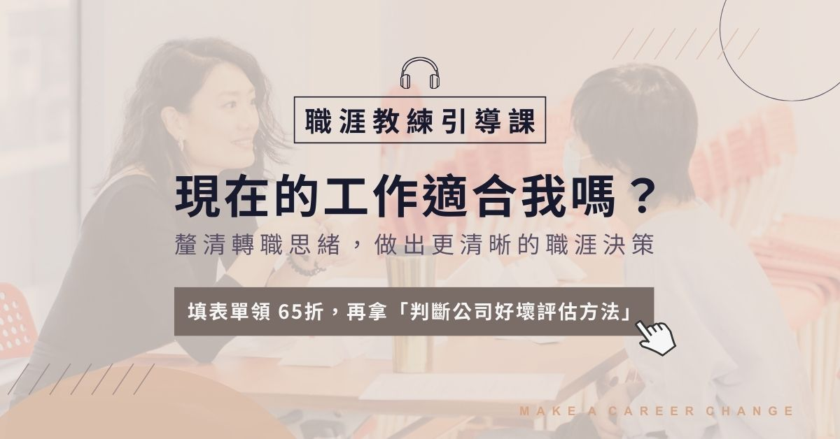 專為考慮轉職的你打造,這堂職涯教練引導課,由豐富「職涯諮詢」和「課程設計」經驗的 Grace 帶入諮詢引導方法,聚焦解決現況卡關,透過「音頻」和「學習單」,協助你釐清思緒,判斷現在的工作適不適合自己。專為考慮轉職的你打造,這堂職涯教練引導課,由豐富「職涯諮詢」和「課程設計」經驗的 Grace 帶入諮詢引導方法,聚焦解決現況卡關,透過「音頻」和「學習單」,協助你釐清思緒,判斷現在的工作適不適合自己。專為考慮轉職的你打造,這堂職涯教練引導課,由豐富「職涯諮詢」和「課程設計」經驗的 Grace 帶入諮詢引導方法,聚焦解決現況卡關,透過「音頻」和「學習單」,協助你釐清思緒,判斷現在的工作適不適合自己。